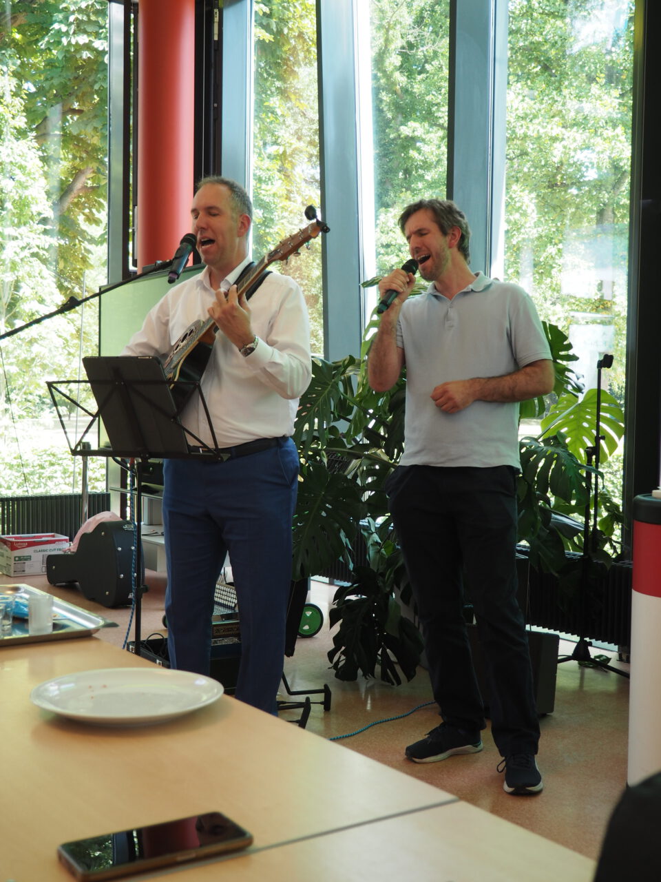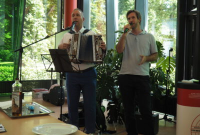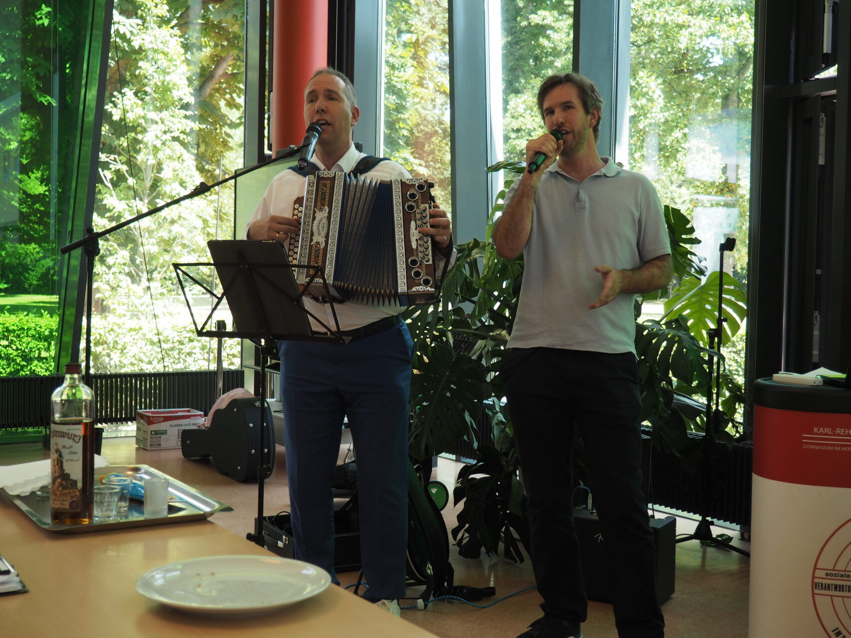 Leinweber selbst muss die von Herzen kommende große Wertschätzung ihm gegenüber erst einmal „verdauen“, bleibt dem sonst so wortgewandten „Rhöner Bub“ einfach die Stimme weg. Diese findet er aber nach einer kräftigen Stärkung wieder – zur Freude der Fangemeinde der legendären „Leinweber-Brothers“. Denn zusammen mit seinem Bruder André F. Leinweber verabschiedet er sich musikalisch mit „Bye, Bye Love“ und als Zugabe packt er dann noch die Steirische Harmonika aus, um vor versammelter KRS-Mannschaft eine umjubelte zweistimmige Jodeleinlage abzuliefern. Und spätestens in diesem Moment ist der KRS-Schulgemeinde vollends bewusst, wer da das Schulschiff verlässt: Hier geht ein von allen Seiten hoch geschätzter „Steuermann“ von Bord, der die KRS durch alle Höhen und Tiefen begleitet und gestaltet hat.