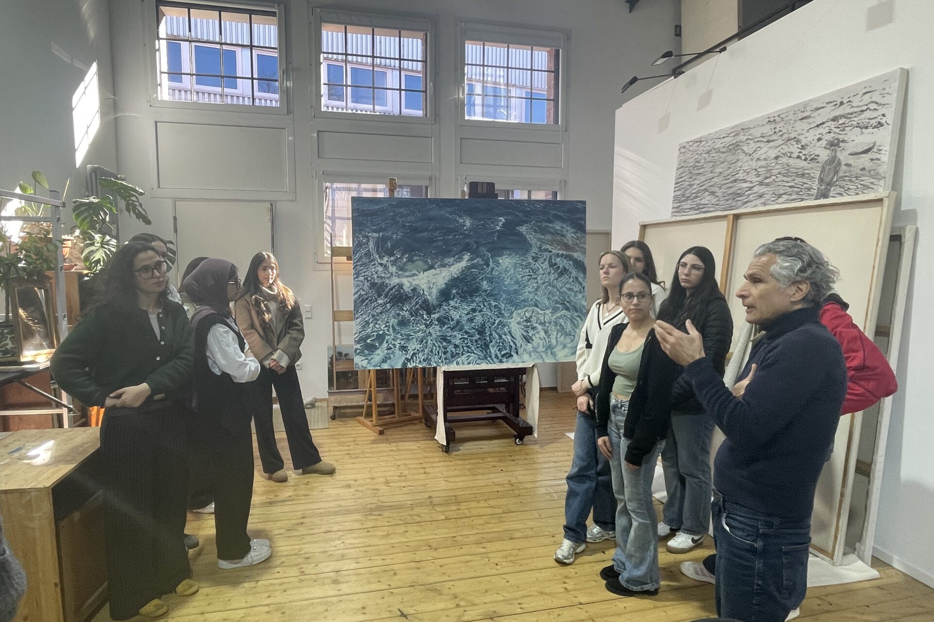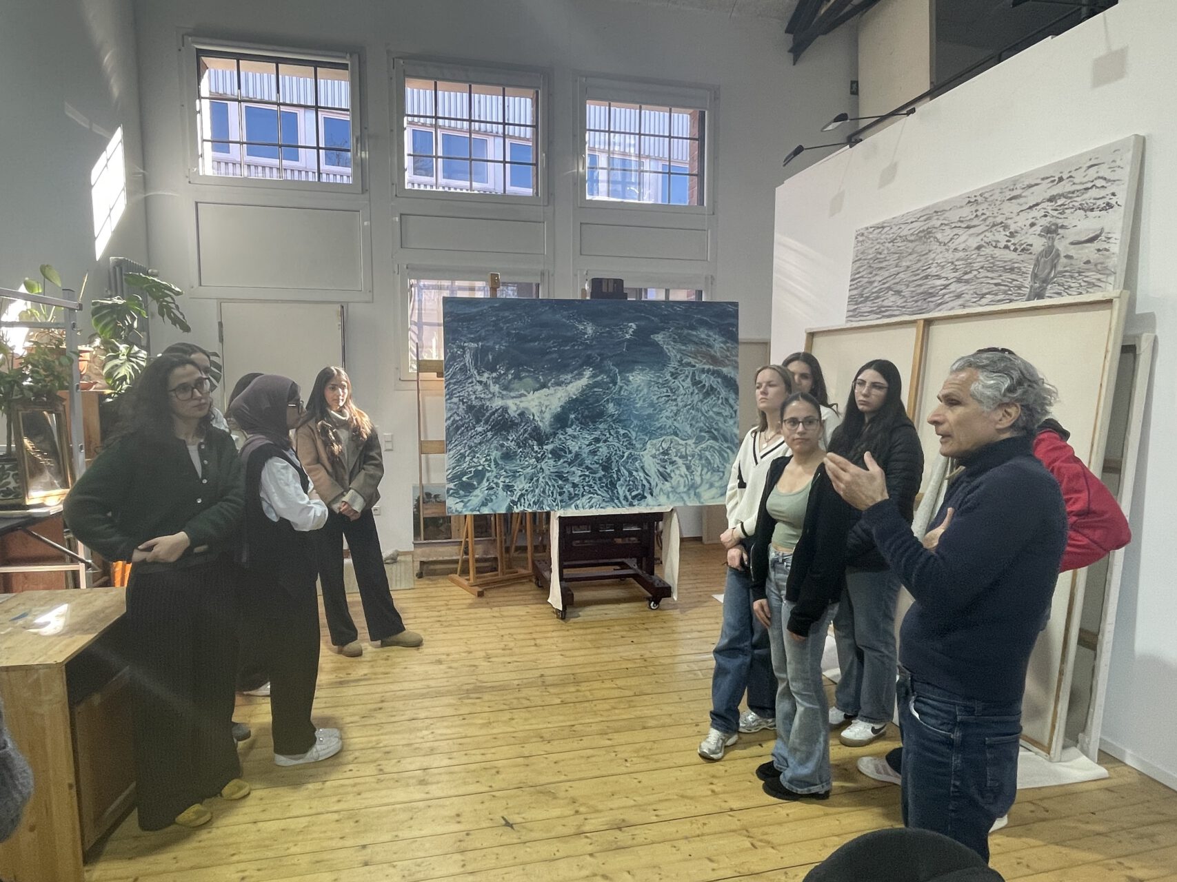 Einen letzten Ausflug für den LK- Kunst sollte es noch geben. Der Iranstämmige Maler Ahmad Rafi stellte uns sein Atelier als außerschulischen Lernort zur Verfügung. Bepackt mit Kuchen und Keksen machten wir uns in Richtung Fechenheim auf den Weg. Ein altes Industriegebäude mit hohen Decken dient Herrn Rafi als Produktionsstätte und Lager für beeindruckende naturalistische Malerei, die er europaweit und im Iran ausstellt.