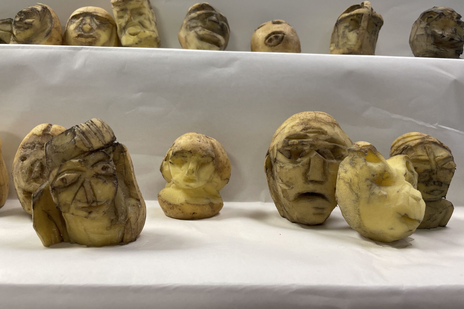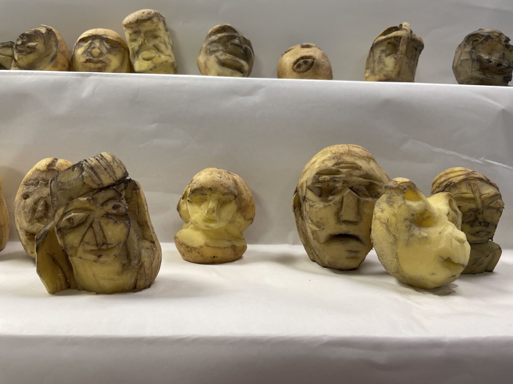 Es entstand im Werkraum ein prozessuales Arrangement aus vielen unterschiedlichen Köpfen, die sich über die Wochen des Trocknens stetig veränderten: Einige erhielten durch Austriebe Haare, andere Bärte durch die austretende Stärke, alle eingegrabene Gesichtszüge. Heute sind sie steinhart.