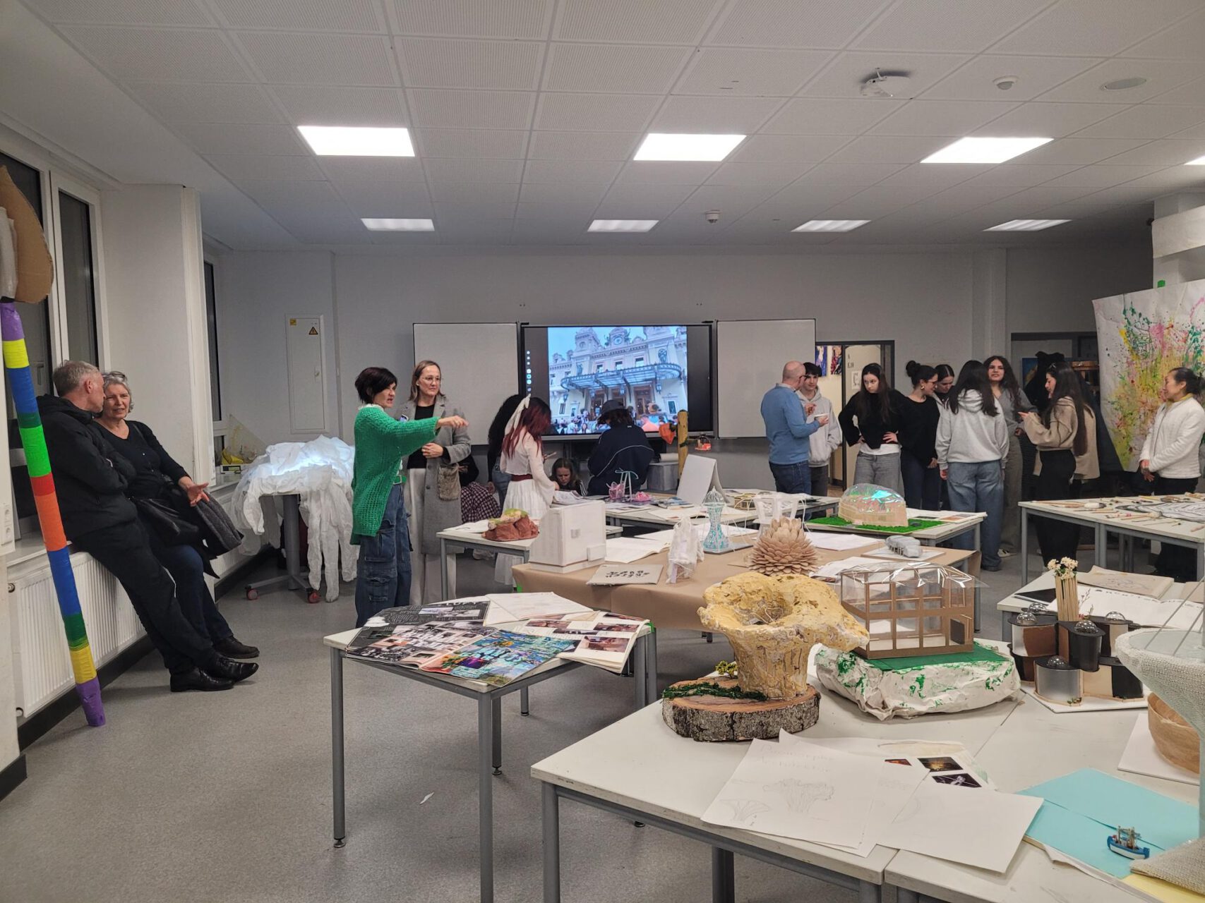 Zwei Jahre durch Dick und Dünn, Hoch und Tief, Rot und Grün, Wasser und Luft, Verzweiflung und Freude, Anstrengung und Kunstgenuss – das verlangt einen Abschluss für alle Beteiligten und insbesondere auch für die Eltern, die im Hintergrund diese Bewegungen verfolgt hatten. So wurden alte und neue Werke aus den Schränken gezogen, die Modelle zum großen Bionik-Architekturprojekt aufgebaut und gemeinsam in der Ausstellung angestoßen auf das Ende des Tutorkurses und die kommenden Abenteuer der Schülerinnen.