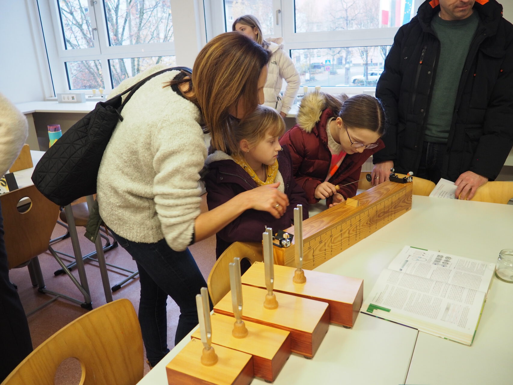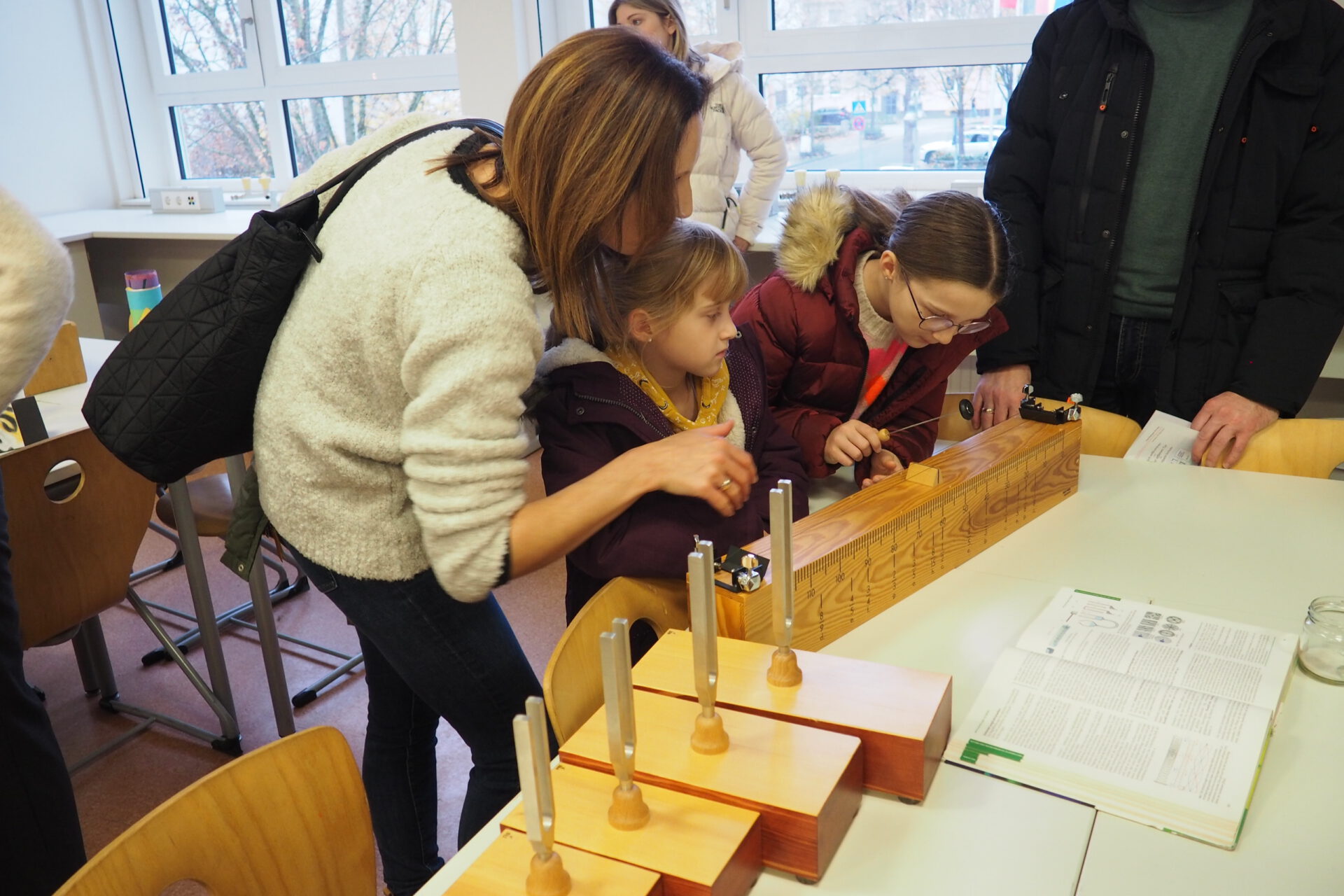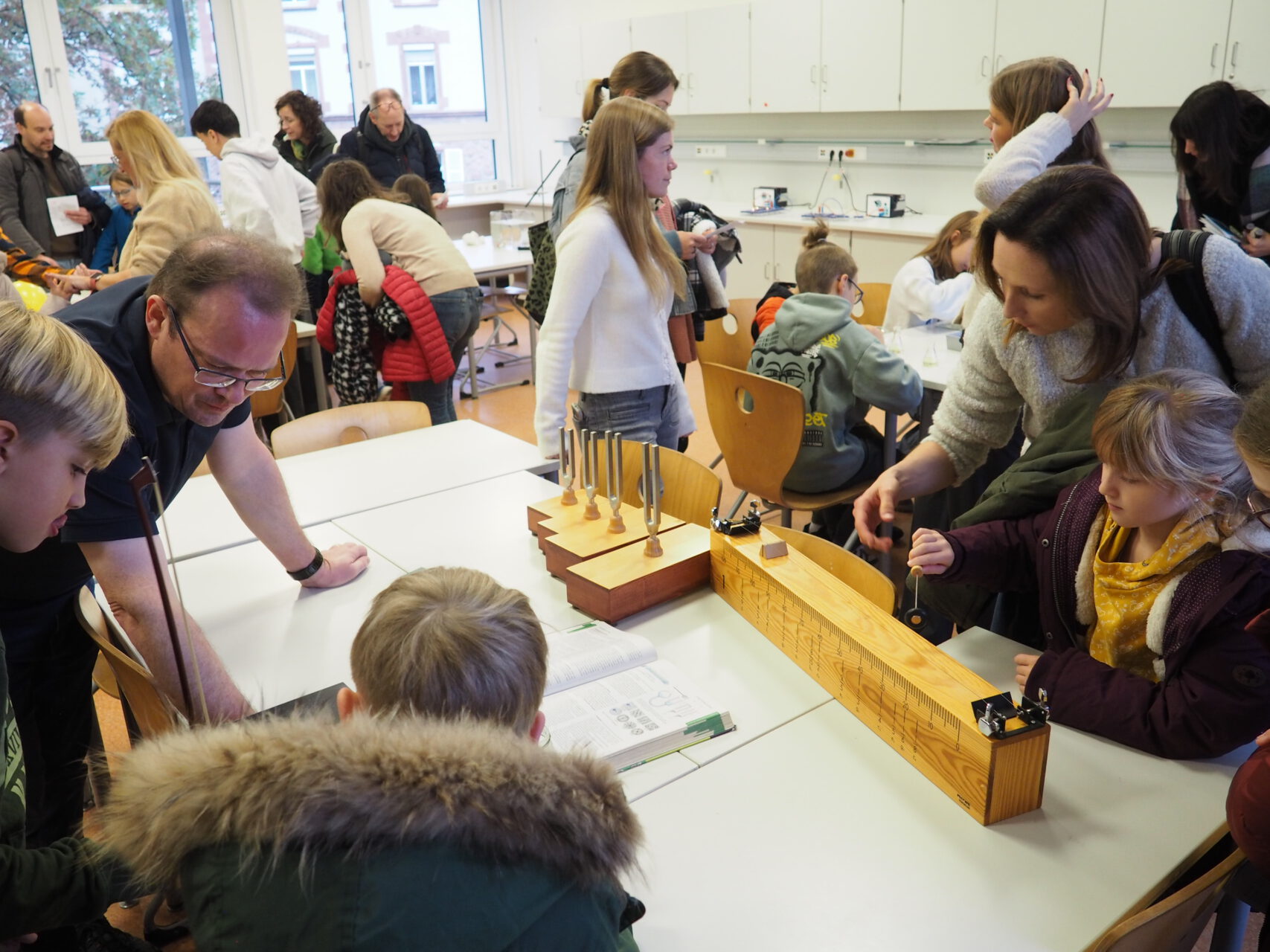 Physik zum Hören und Anfassen: Mithilfe eines Monochords konnten die jungen Besucherinnen und Besucher des „Tages der offenen Tür“ erfahren, was mit Tonhöhen passiert, verkürzt oder verlängert man die Saiten des Instruments. Foto: KRS