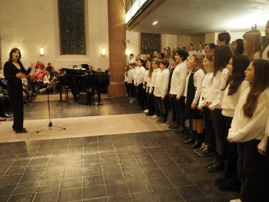Gudrun Hildebrandt entlockt als neue Kinderchor-Leiterin der jungen KRS-Kinderschar eine überzeugende Darbietung von Teilen aus Uli Führes Weihnachtsmusicals „AM Himmel geht ein Fenster auf“.