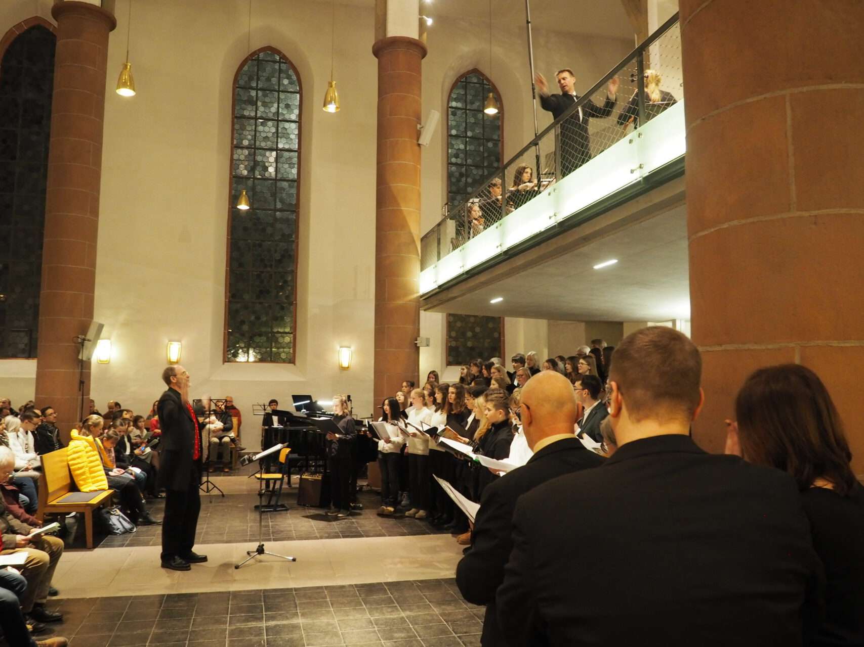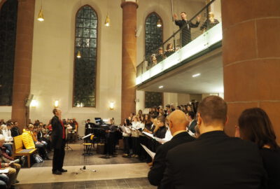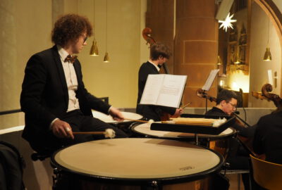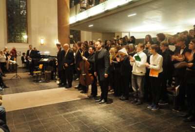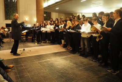 Die Komposition „O Domine Jesu Christi“ des italienischen Spätrenaissance-Komponisten Giovanni Gabrieli, der unter anderem durchaus als Erfinder der venezianischen Mehrchörigkeit gelten darf, setzt einen zurückhaltenden Kontrapunkt. Hier zählt jede Stimme im Klanggefüge und Daniel Ulb hat seinem Q1-Leistungskurs eine umsetzbare Bearbeitung erstellt, die insbesondere auch das so oft vorkommende Stilmittel der Echowirkung gut hervorheben kann.
