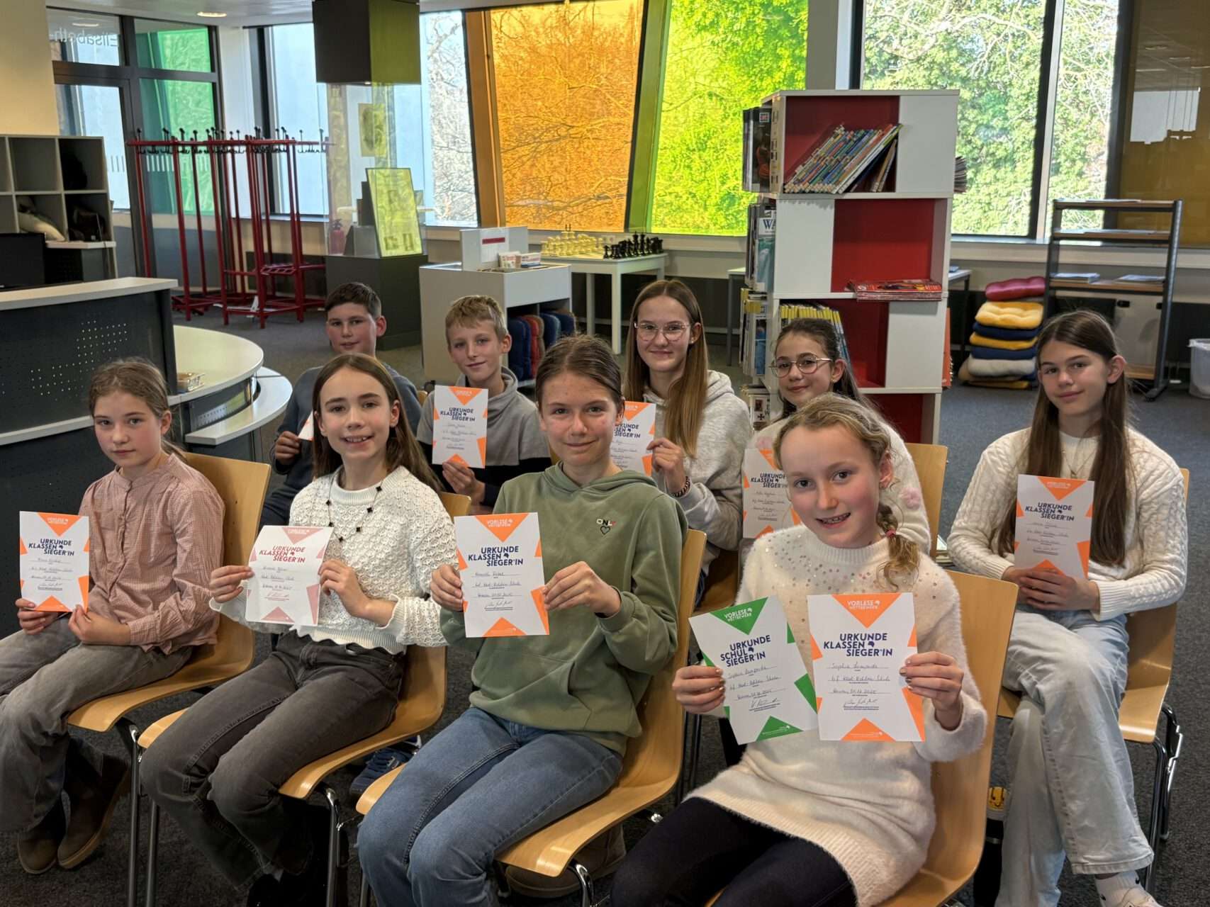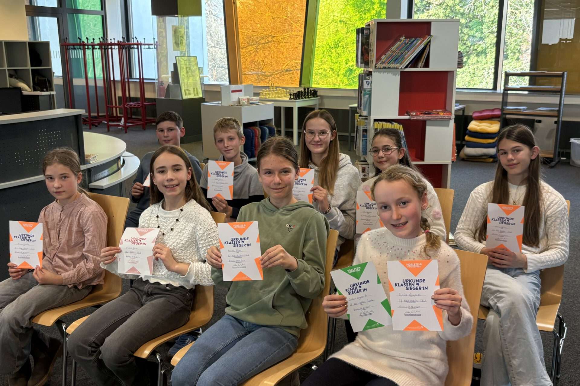 Gut vorbereitet und mit dem Lieblingsbuch ausgerüstet, starteten am 1. Dezember 2025 neun Schülerinnen und Schüler der Klassen 6 in den Schulentscheid, der in der Elisabeth Schmitz-Bibliothek stattfand. In den davor liegenden Wochen hatten sie alle die Klassenentscheide gewonnen und sich somit für den Schulentscheid qualifiziert. In der nun folgenden Runde bestand die Schwierigkeit nicht nur darin, die eingeübte Textpassage eines Romans gut vorzulesen, sondern auch einen fremden Text flüssig und gestaltend zu präsentieren. Bei diesem Fremdtext handelte es sich um Cornelia Funkes bekannten Abenteuerroman „Igraine Ohnefurcht“, der von der Autorin selbst illustriert wurde. Das Buch erzählt von der Zwölfjährigen Igraine , die zwar die Tochter einer Zaubererfamilie ist, sich aber gar nicht für Zauberei interessiert. Igraine würde viel lieber eine richtige Ritterin werden, die Waffengänge und Turniere besteht und Drachen befreit. An ihrem 12. Geburtstag wird ihr Zuhause, Burg Bibernell, plötzlich bedroht und weil Igraine und ihr Bruder in diesem Moment auf sich alleine gestellt sind, müssen sie Bibernell aus eigener Kraft verteidigen. Nach der ersten Leserunde hatte die Jury gleich mehrere Favoriten ermittelt, die eine gute Chance auf den Sieg hatten. Doch in der entscheidenden zweiten Runde gab es zwei klare Siegerkinder, nämlich Sophia Lamperda aus der 6f und Julian Grimm aus der 6h. Die Fotos zeigen alle Klassensieger und -siegerinnen und die Schulsieger zusammen mit der Jury (Frau Bodensohn, Frau Kopitzki, Frau Wiegand, die beiden Schulsieger des letzten Jahres, Mattis Beißer und Ida Bedürftig). Bei der Siegerehrung, der auch Herr Rollmann beiwohnte, erhielten alle Schülerinnen und Schüler eine Urkunde für den Klassensieg. Die Schulsieger erhielten eine zweite Urkunde sowie je einen Büchergutschein der „Buchhandlung am Freiheitsplatz“, der wir für die nette Unterstützung dieses Wettbewerbs herzlich danken.