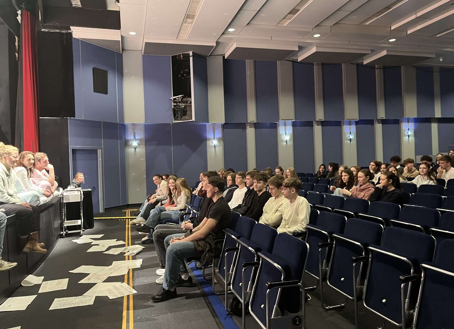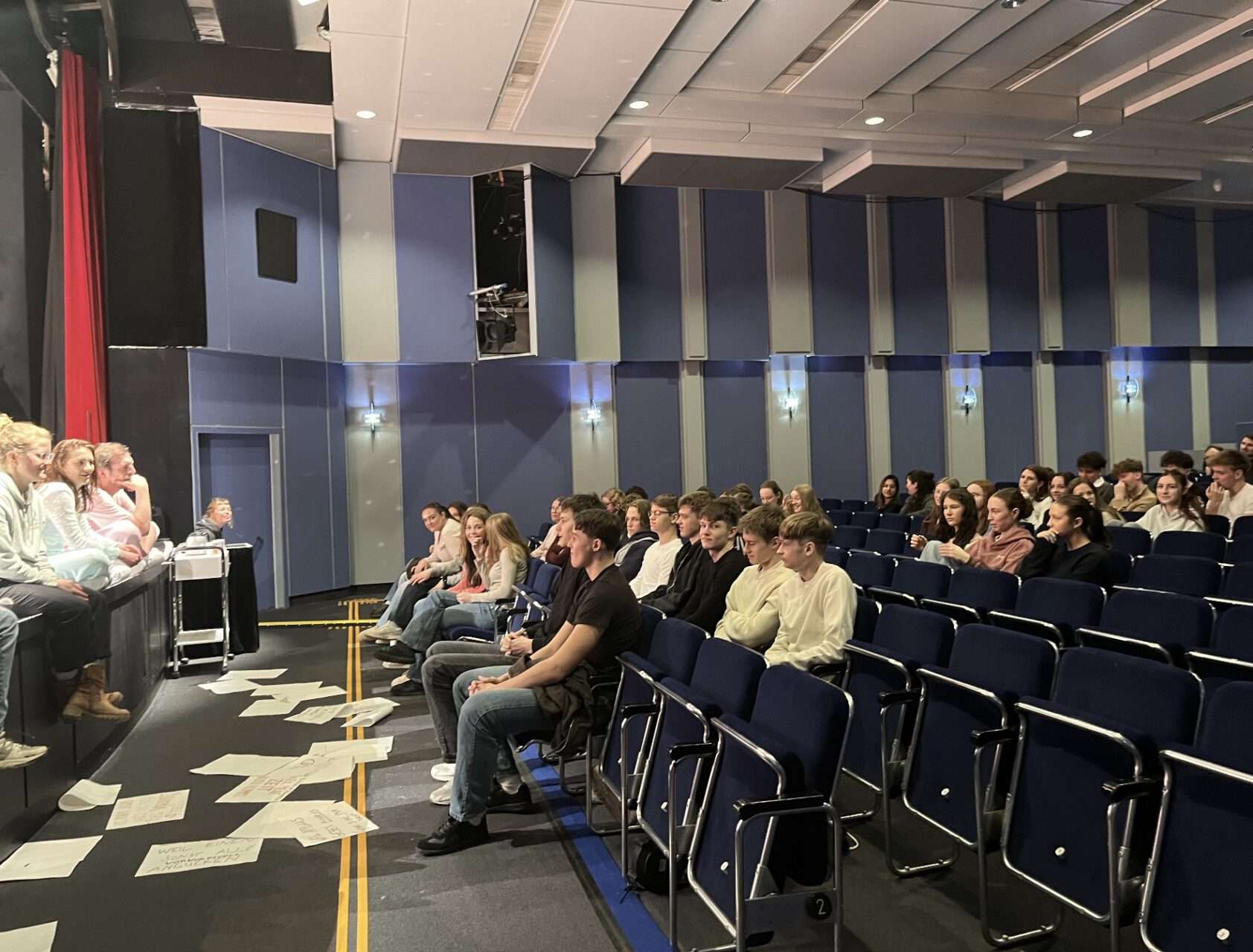 Im Anschluss an die Probe kamen die Schülerinnen und Schüler mit den Spielern und der Regisseurin ins Gespräch. Dabei konnten sie nicht nur Fragen stellen, sondern wurden auch selbst aktiv einbezogen: Ihre Zuschauereindrücke flossen direkt in die Weiterarbeit am Stück ein, das am Freitag, den 6. Februar, Premiere feiert.