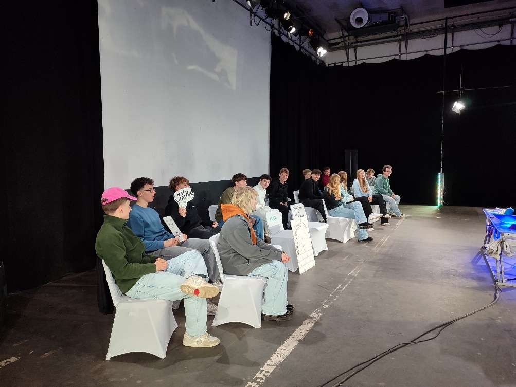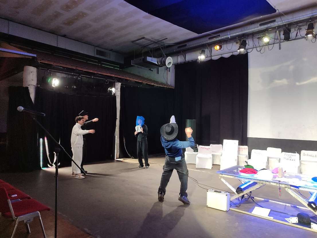 Im Anschluss an die Vorstellung hatten die Schülerinnen und Schüler Gelegenheit, den Spielerinnen und Spielern Fragen zu stellen und mehr über die Konzeption und Entstehung des außergewöhnlichen Stücks zu erfahren. Schließlich waren die Jugendlichen selbst an der Reihe und konnten im Bühnenbild und mit den Requisiten des Stücks experimentieren und eigene kreative Szenen erarbeiten. Schwerpunkte waren dabei das schnelle Wechseln von Rollen und der Einsatz von Requisiten, die bewusst künstlich wirken und das Theater als solches sichtbar machen. Den Rückweg trat die Gruppe mit vielen neuen Eindrucken im fallenden Schnee an.