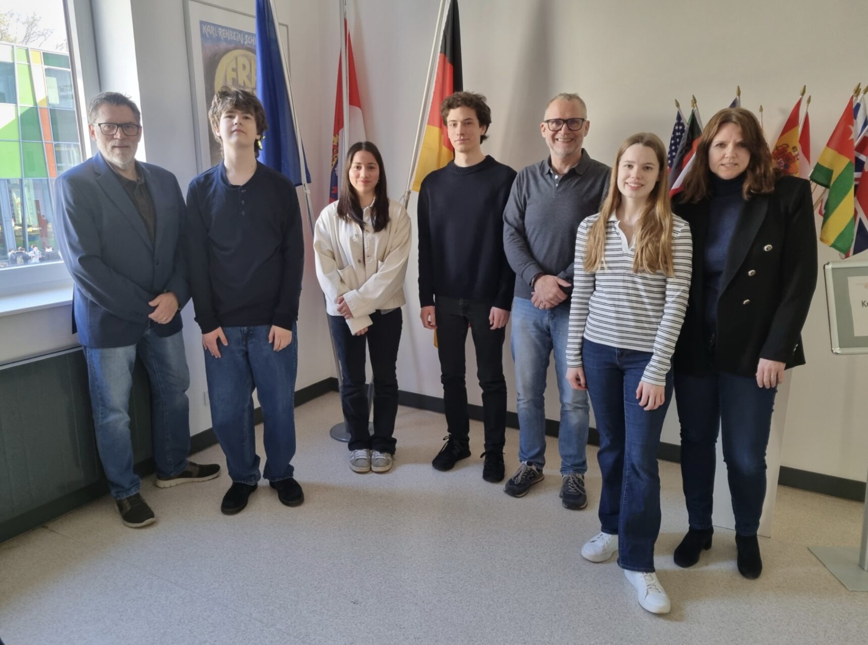 BU: Gratulation für die erfolgreichen Teilnehmerinnen und Teilnehmer beim diesjährigen Landes-Wettbewerb „Jugend musiziert“: KRS-Leiter Stephan Rollmann gratulierte für die Schulgemeinde (von links) Borjan Jovanov (von links), Sienna Münch, Lukas Bender und Charlotte Volbers. Über den Erfolg freuten sich auch Schulleitungsmitglied Ludwig Fleischmann (Mitte) und die PHM-Klavierpädagogin Julia Kohlberger (rechts). Foto: KRS