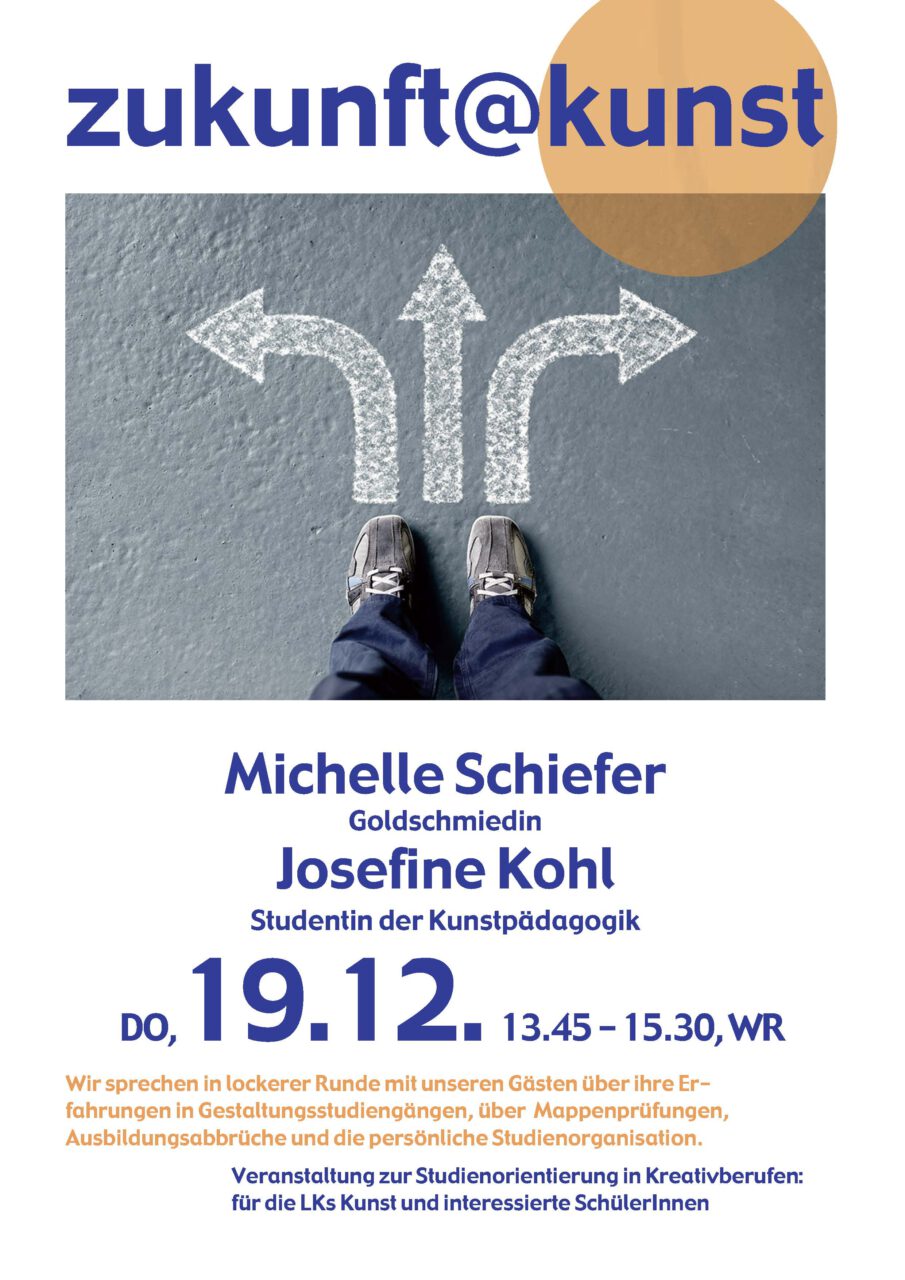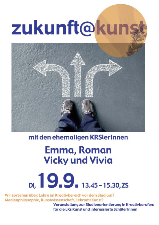Bei der Veranstaltung „Zukunft@Kunst“, die sich vor allem an die Leistungskurse richtet, liegt der Fokus auf dem Kennenlernen künstlerischer Studiengänge oder Ausbildungen. Hierbei besuchen einmal im Jahr zwei junge Studierende oder Auszubildende die KRS. Für die Schülerinnen und Schüler bietet sich dabei die Gelegenheit, durch direkte Erfahrungsberichte und den Dialog mit den Studierenden, einen Eindruck eines künstlerischen Studiengangs zu bekommen.